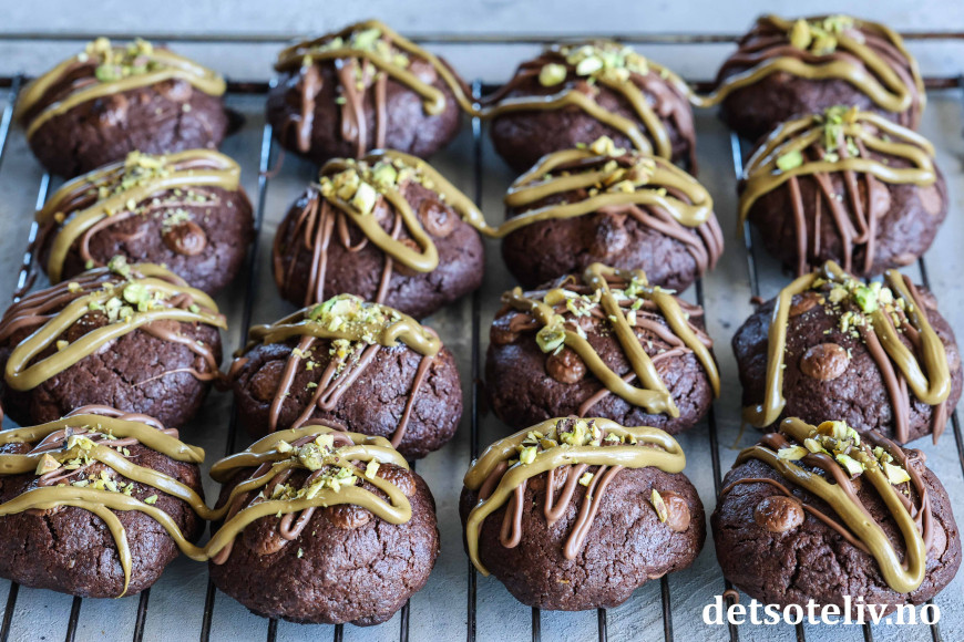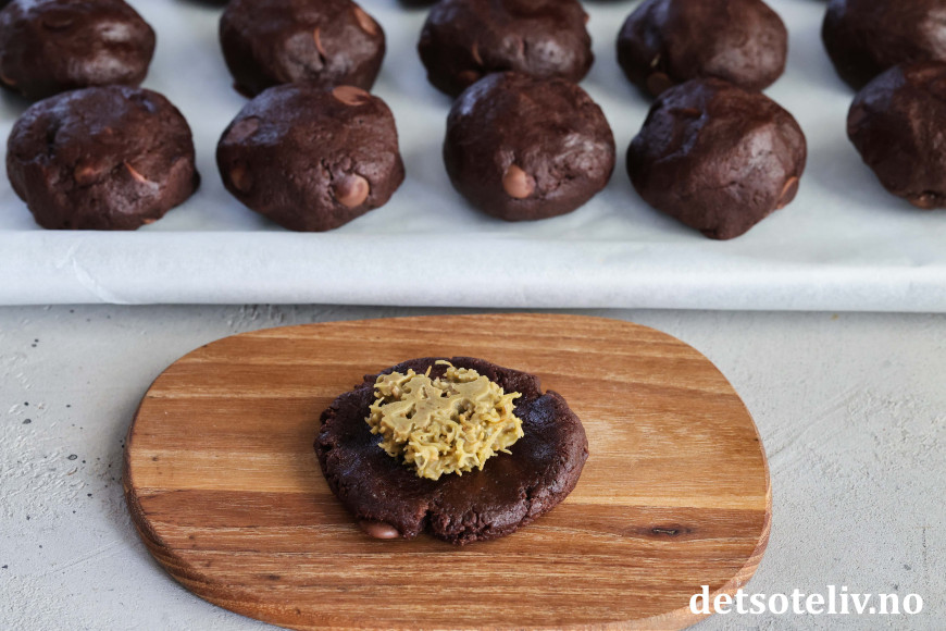 Kombinasjonen av mørk sjokoladecookie og det knasende pistasjfyllet blir fantastisk godt!
