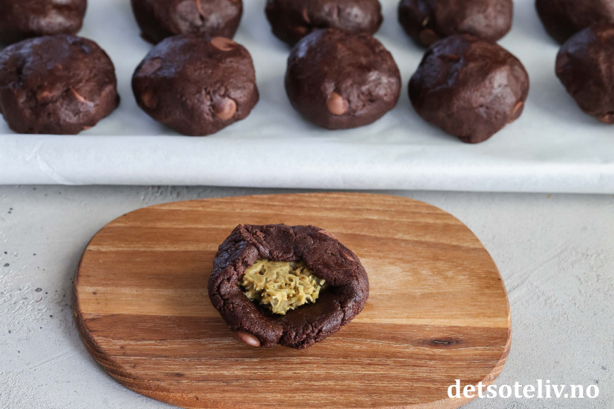Del deigen i 14 jevnstore deler (ca. 60 gram deig per kake). Klem deigen litt flat mellom hendene og legg på en fryst pistasjtopp. Klem deigen rundt pistasjtoppen og pass på at deigen er tett rundt fyllet. Klem ned noen få melkesjokoladeknapper på toppen av kaken.