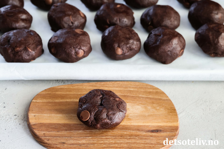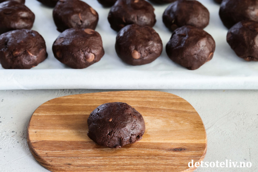 Finn frem en fjøl som du dekker med bakepapir. Form 14 teskjestore topper (jeg lagde som sagt større porsjon fordi jeg også lagde pistasjfyll til Dubai Chocolate Chip Cookies og formet til sammen litt over 30 topper).
