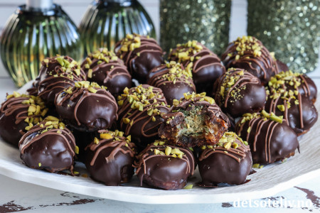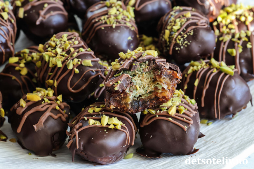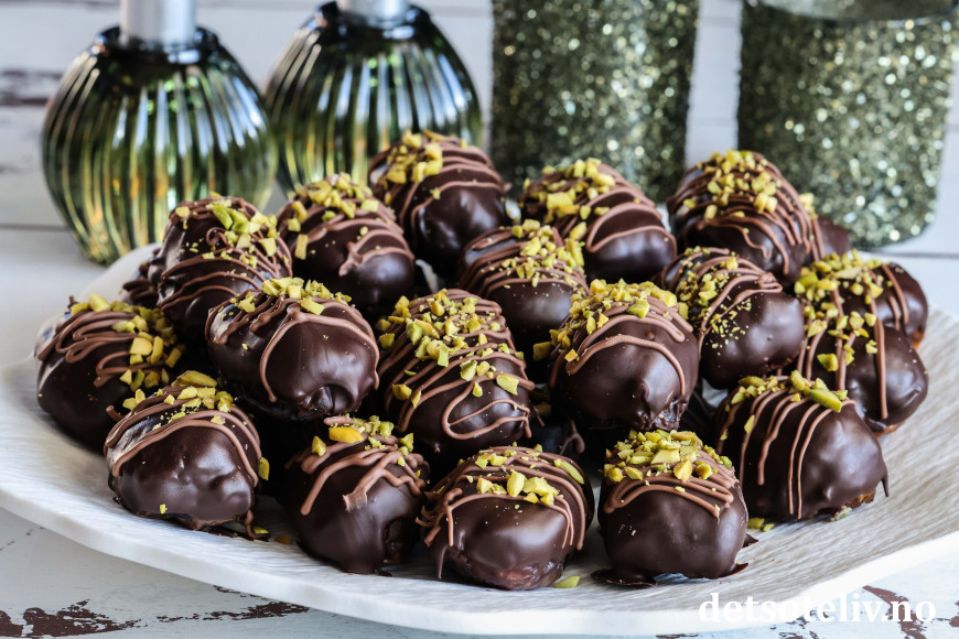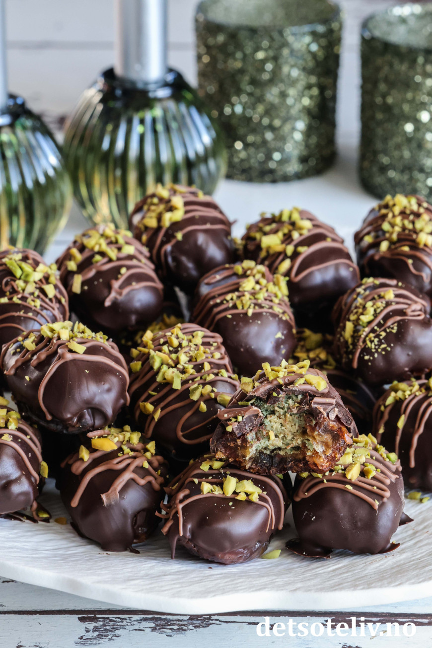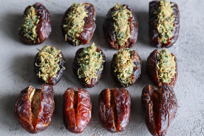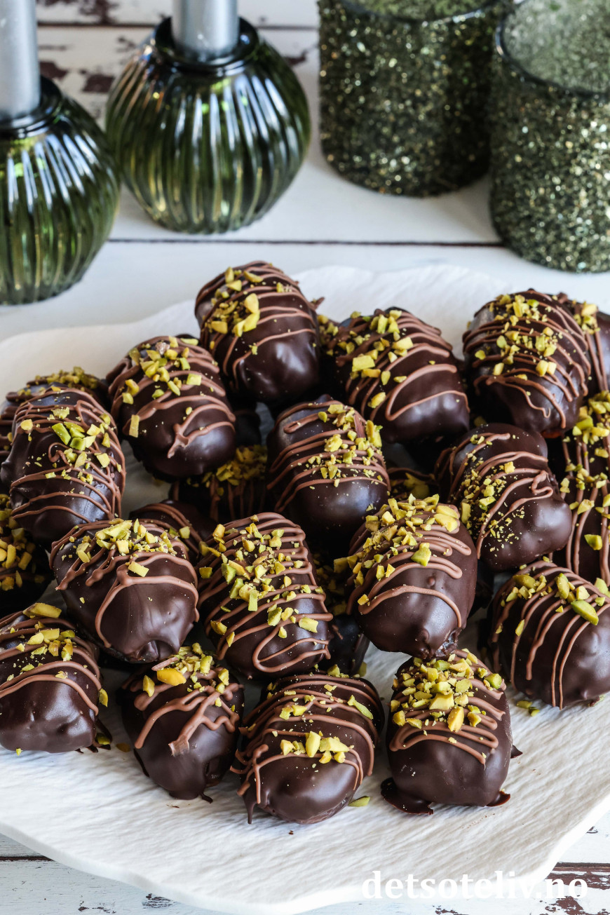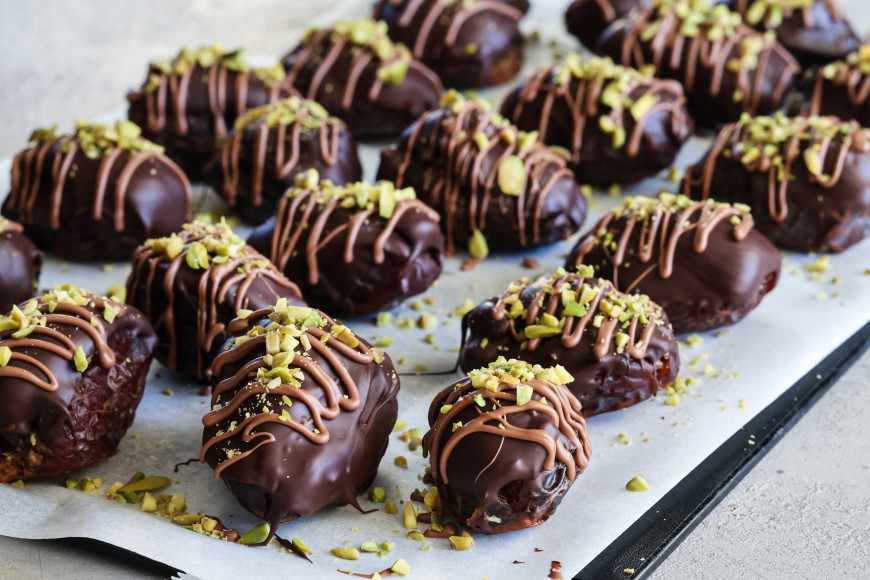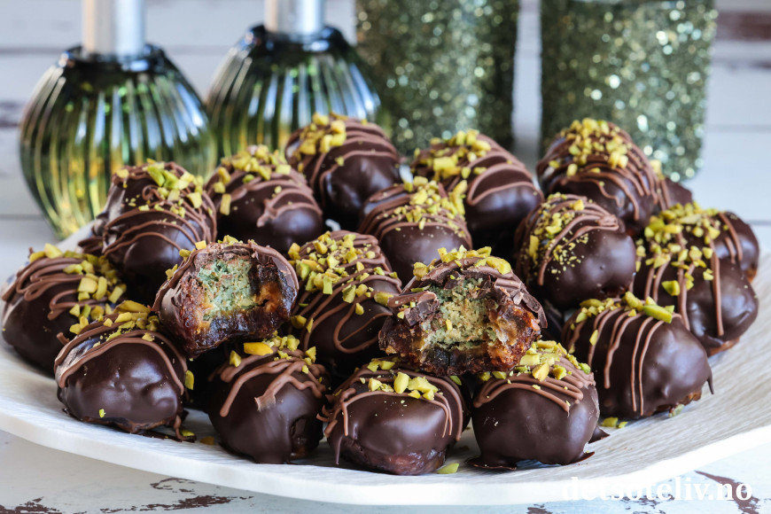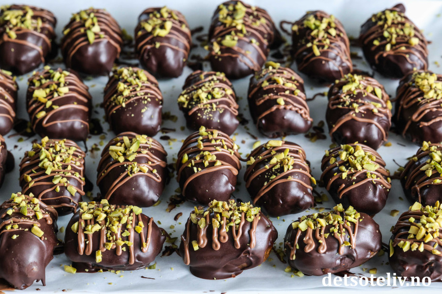 Her er en litt sunnere variant der den karakteristiske kadayif-og pistasjkremen fylles i dadler, som deretter dyppes i smeltet sjokolade.