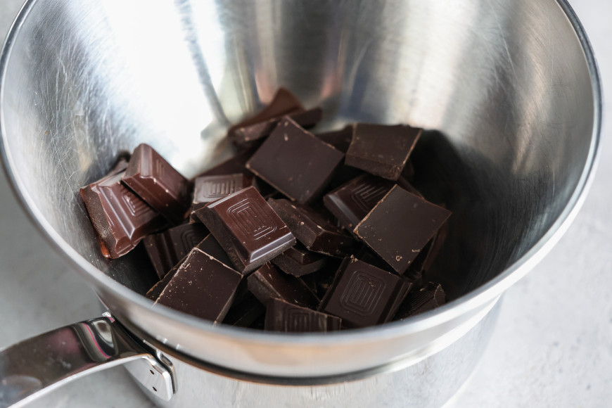 Smelt kokesjokoladen i en bolle over vannbad (eventuelt med litt delfiafett for å gjøre sjokoladen litt mer flytende).
