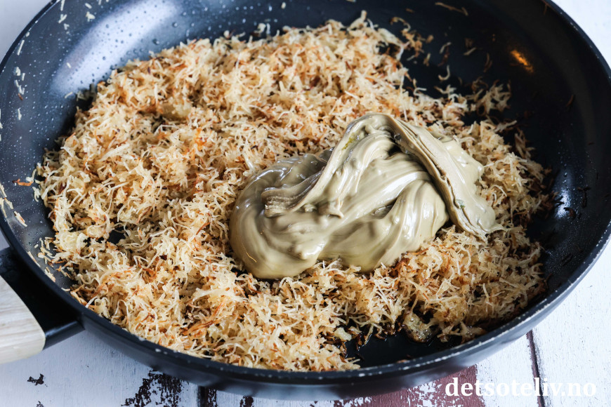 Vend godt sammen med stekespaden, slik at pistasjkremen fordeler seg jevnt med den sprøstekte deigen.