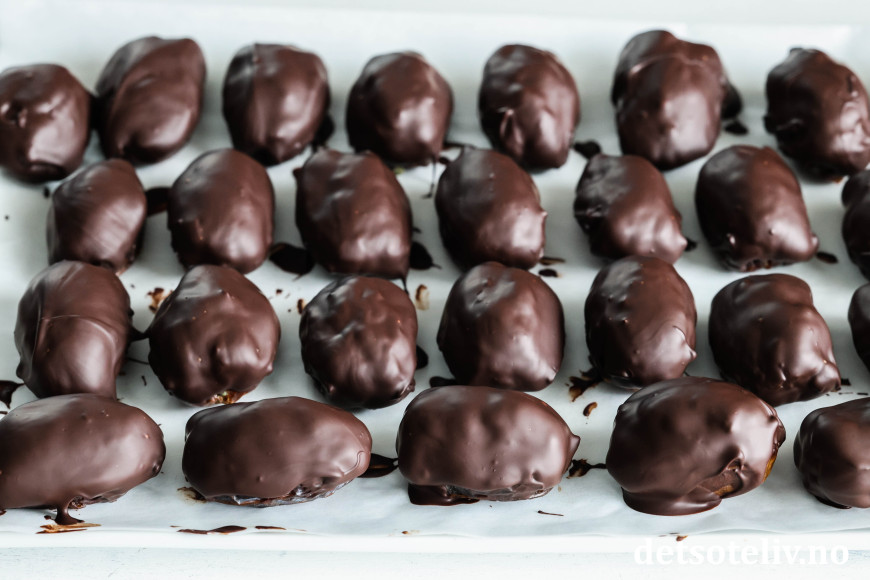 Sett dadlene tilbake i kjøleskapet til sjokoladen har stivnet helt.