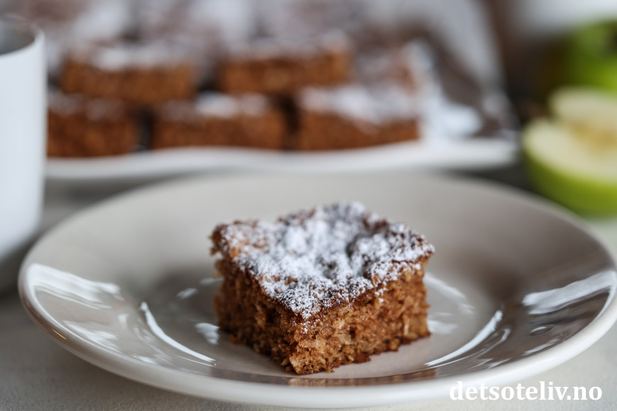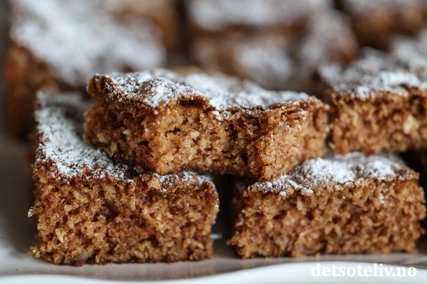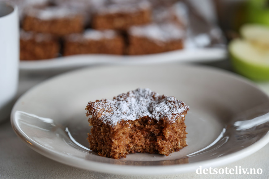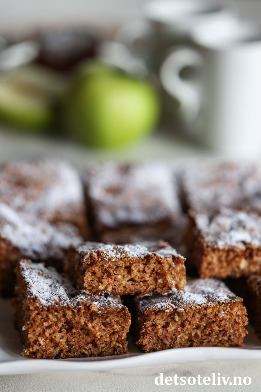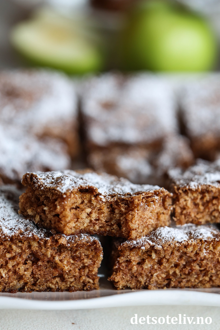 Kaken inneholder revet eple, kokos og kanel og er således et kjærkomment alternativ til de "vanlige" langpannekakene. Kakedeigen skal bare røres raskt sammen og kaken er derfor svært rask å lage.