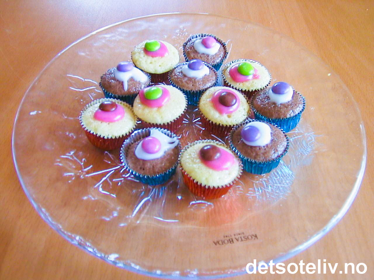 Sett små konfektformer utover stekeplaten. Fyll hver form med ca 1 ts deig (se tips). Stek muffinsene midt i ovnen ved 180°C i ca 10-12 min, eller til de er lett gyldne. La muffinsene bli helt kalde før de pyntes med litt glasur og Smarties.
