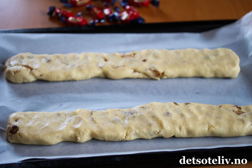 Legg lengdene på en bakepapirdekket stekeplate med god avstand mellom. Trykk lengdene litt flate med fingrene.