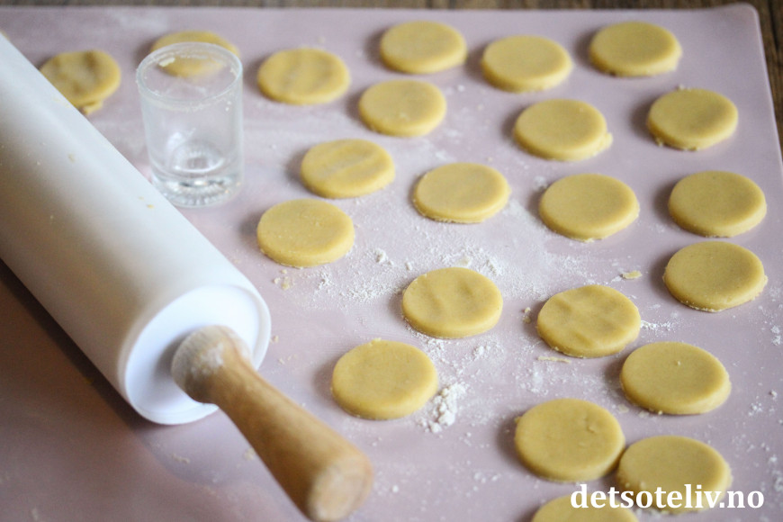 Ta noen biter deig av gangen og kjevle den ut nokså tynt (se tips). Stikk ut små rundinger som er 3–5 cm i diameter (se tips).