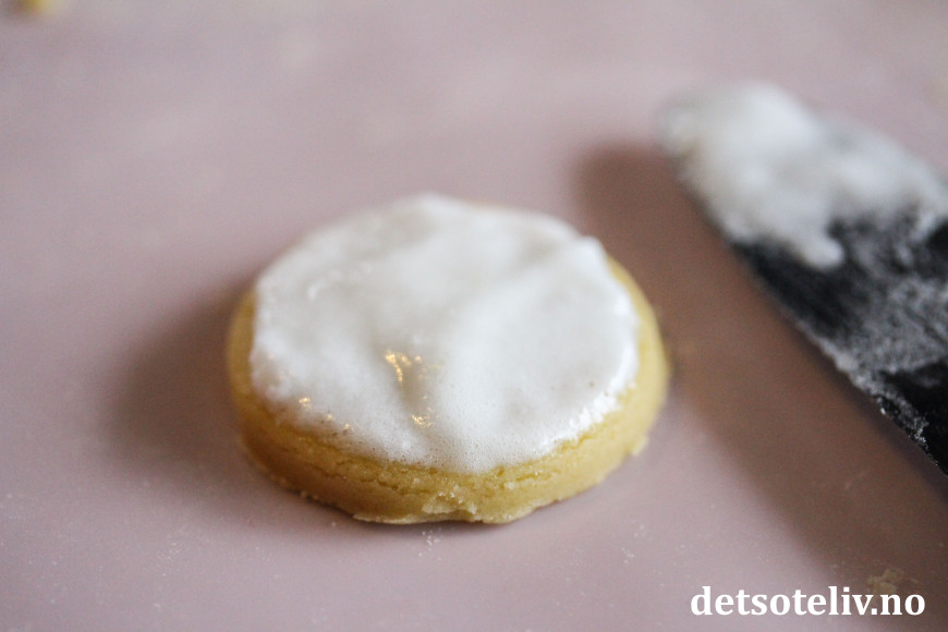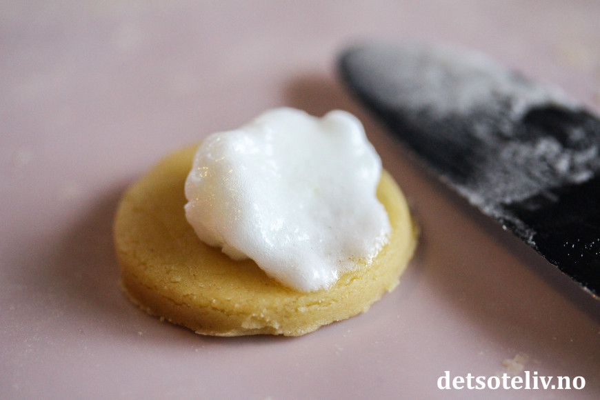 Ta noen biter deig av gangen og kjevle den ut nokså tynt (se tips). Stikk ut små rundinger som er 3–5 cm i diameter (se tips). Smør et lag med marengsglasuren over hver kake ved hjelp av en smørekniv.