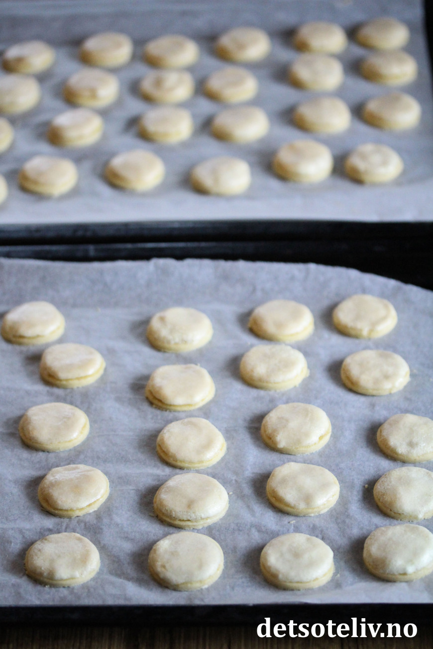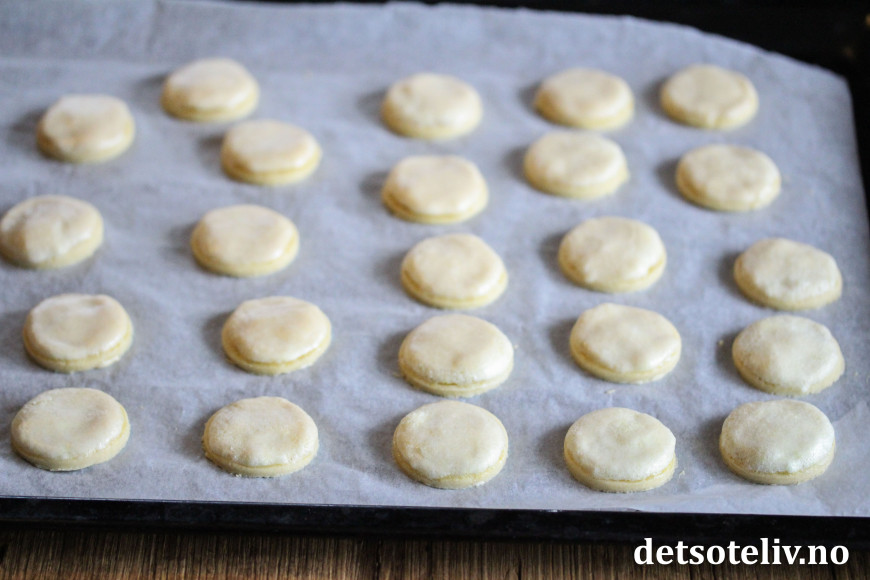 Legg kakene på bakepapirdekkede stekeplater. Stek kakene midt i ovnen ved 125°C i ca. 20 minutter. Pass på at kakene ikke blir brent. Kakene er ferdig når bunnen er sprø og marengsen svakt gyllen.