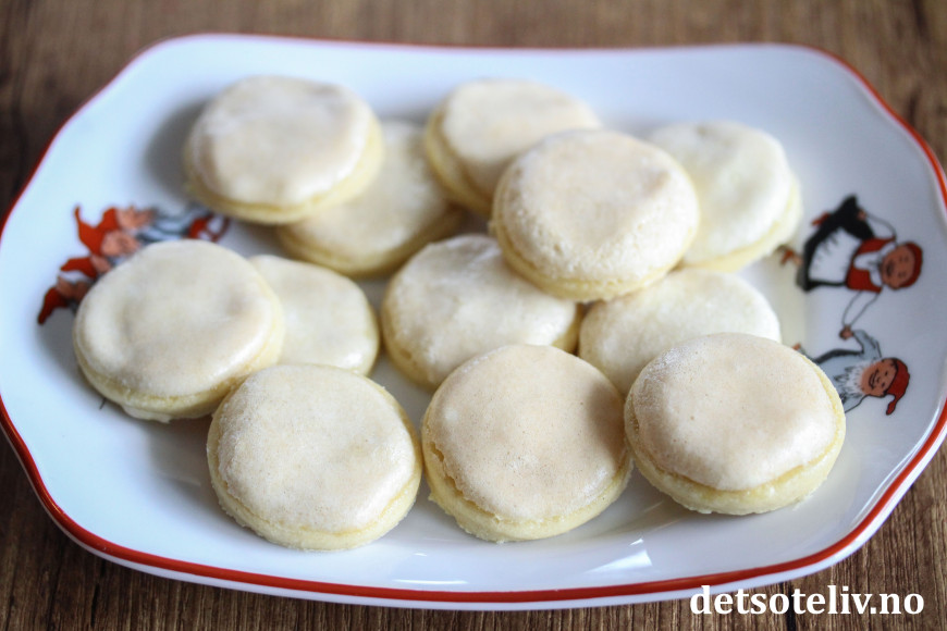 Pass på at kakene ikke blir brent. Kakene er ferdig når bunnen er sprø og marengsen svakt gyllen.