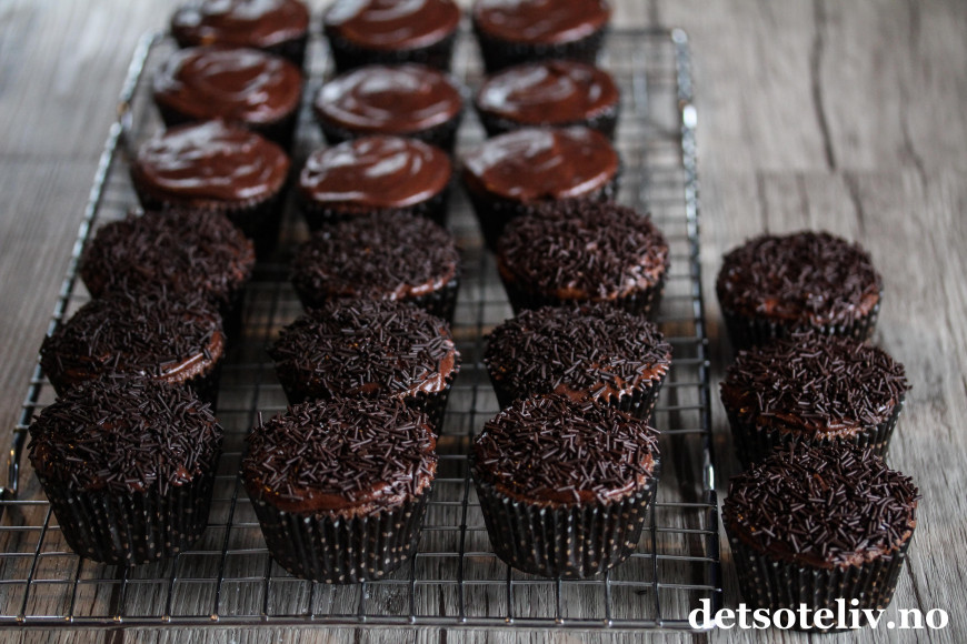 ♥ Det er viktig at muffinsene er helt kalde før du har på sjokoladekremen, ellers smelter sjokoladekremen.