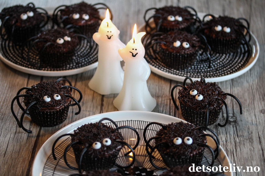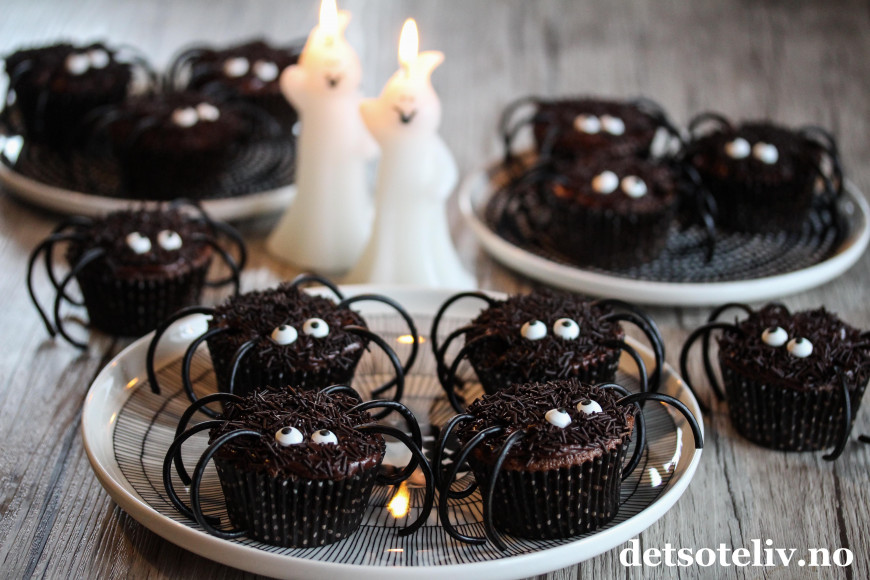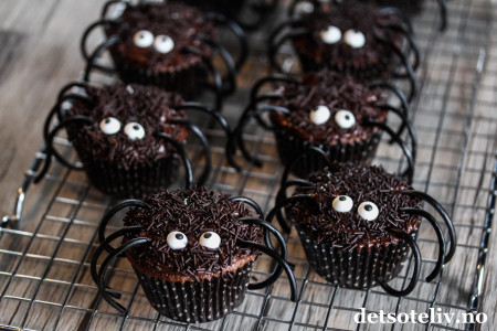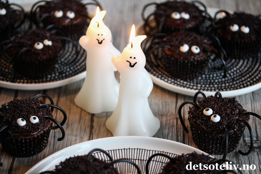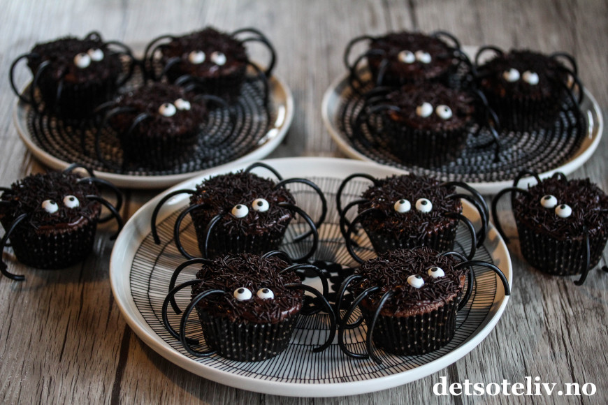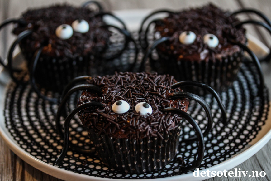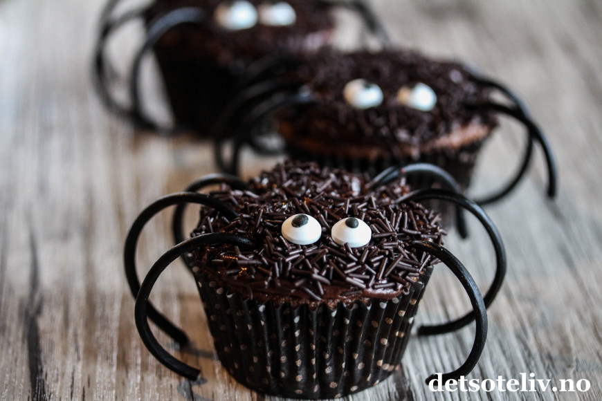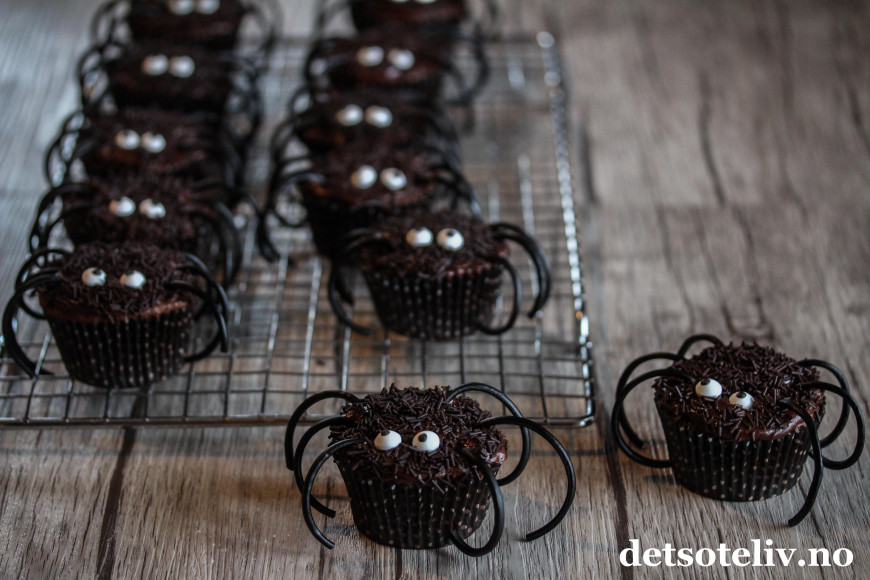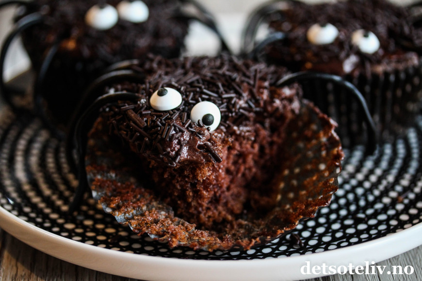 Edderkoppmuffinsene lages med utgangspunkt i supermyke sjokolademuffins med sjokoladekrem.