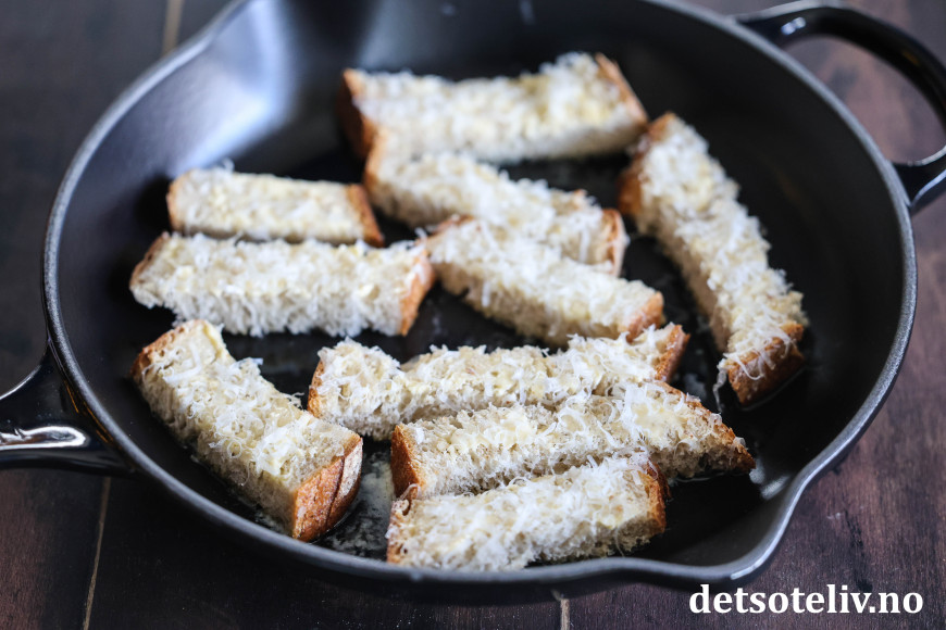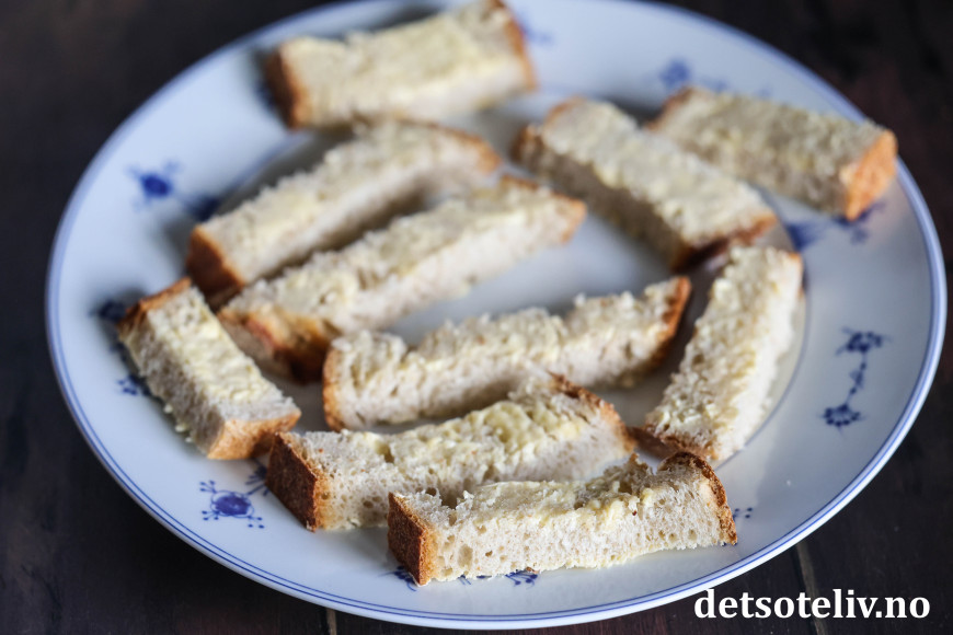 ♥ Hvis du vil unngå smør og ost, kan du droppe å ha dette på brødpinnene. I stedet kan du toaste brødskivene i brødristeren og deretter skjære dem opp i pinner. Men smaken blir da så klart ikke helt den samme. 😊