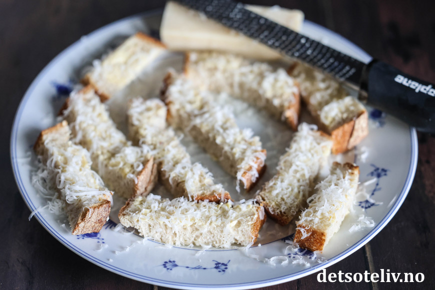 Hvis du vil, kan du også ha revet parmesan over brødpinnene.