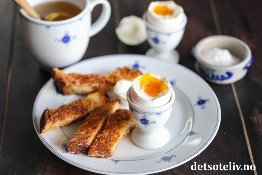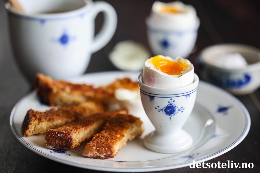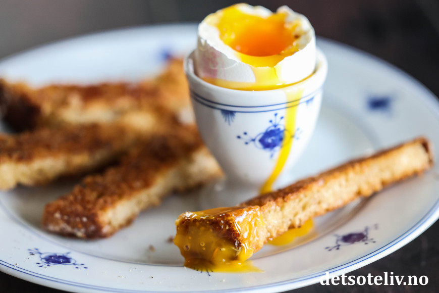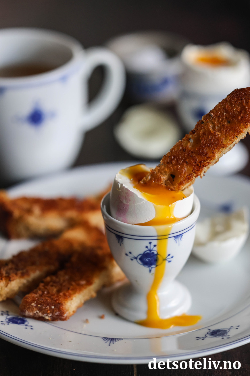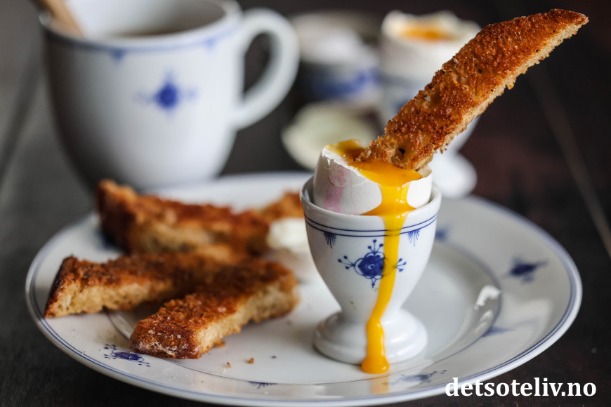 Her skal det være kokte egg med rennende eggeplomme, som man kan dyppe brødpinner i.