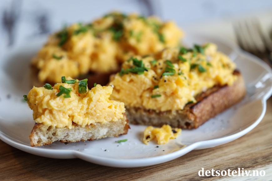 Eggerøre på toast blir best med perfekt myk og akkurat passe bløt eggerøre. Se mine triks for å få til dette i innlegget her: Kremete eggerøre.