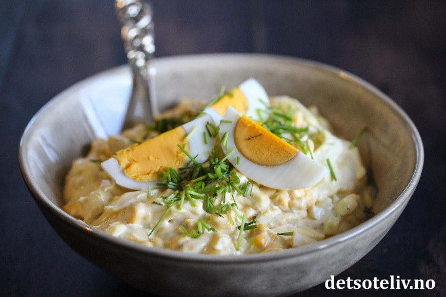♥ Denne eggesalaten er temmelig mektig. Ønsker du å lage en lettere variant, kan du redusere på mengden majones. Bruk i stedet litt mer rømme og bytt ut seterrømme med lettrømme.