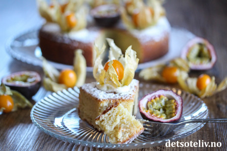 Avkjøl kaken i formen. Løsne kaken fra formen med en skarp kniv. Ta kaken ut av formen og fjern bakepapiret. Sett kaken på et passende fat. Sikt litt melis over den kalde kaken og pynt med physalis og pasjonsfrukt.