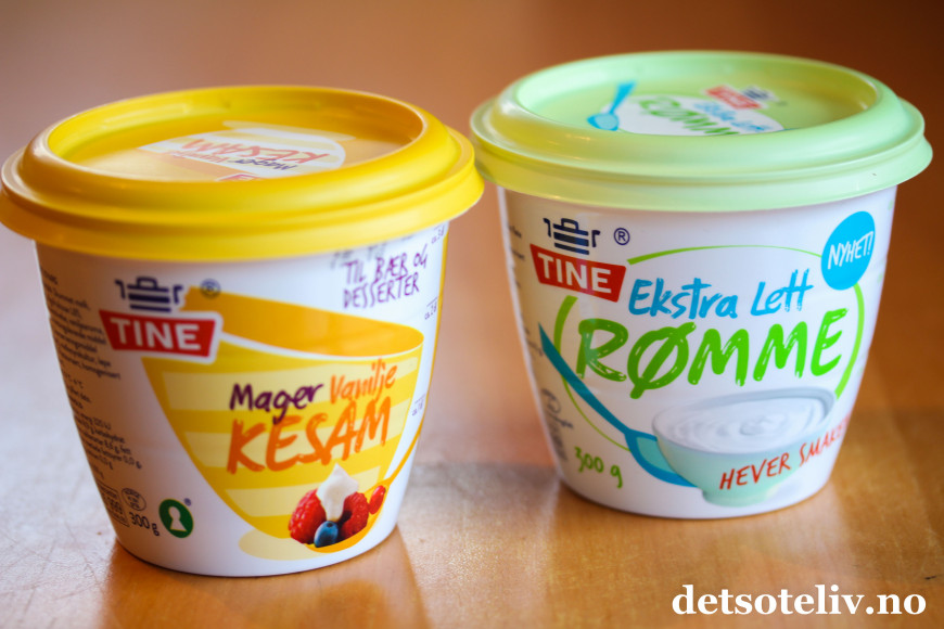 ♥ Jeg har her brukt mager variant av vaniljekesam og det nye produktet ekstra lettrømme. Kesam (også kalt kvark) er en mager form for ferskost, se f eks beskrivelsen på nettsiden til produsenten TINE her. Vanlig type vaniljekesam og lettrømme kan selvsagt også brukes.