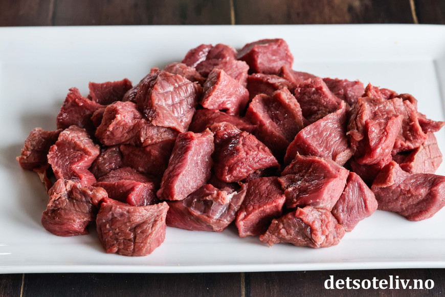 Start med å skjære elgkjøttet i store terninger (ca. 4 x 4 cm).