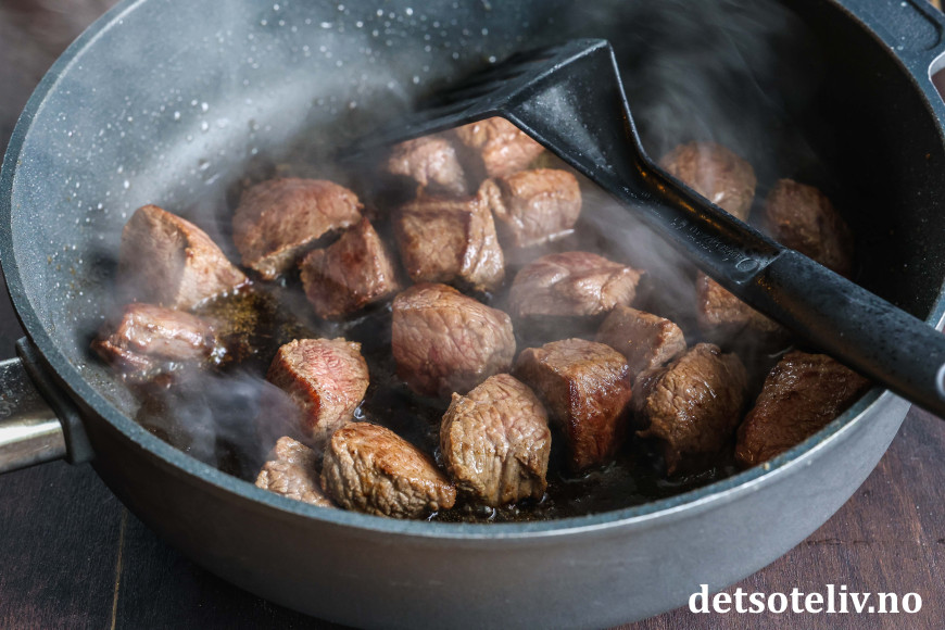 Finn frem en gryte og en stekepanne. Smelt en god klatt av smøret i stekepannen og brun kjøttbitene godt i pannen på alle sider. Ikke ha for mange kjøttbiter i pannen om gangen, slik at alle kjøttbitene har god nok plass i pannen til å bli brunet skikkelig. Krydre kjøttbitene med salt og pepper.