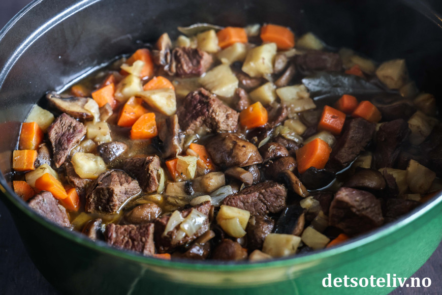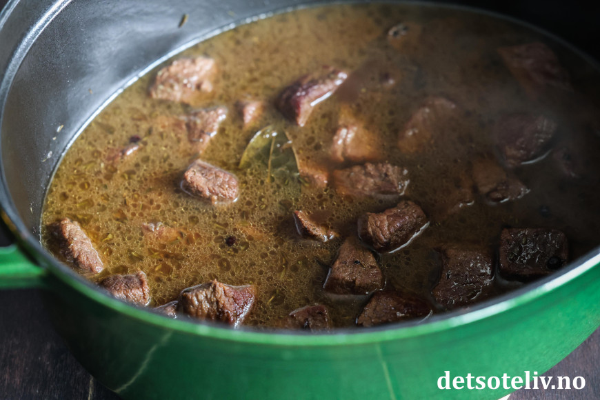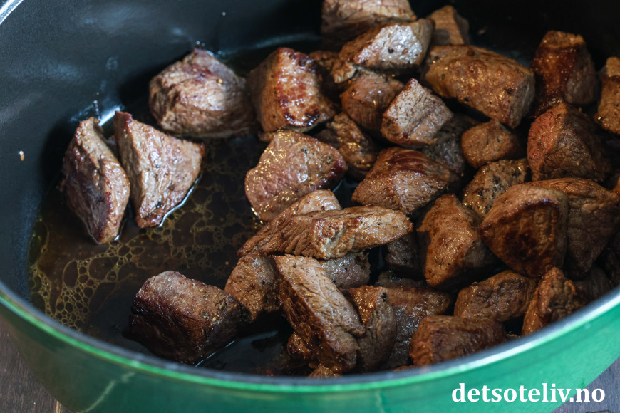 Ha de brunede kjøttbitene i gryten. Kok ut stekepannen med litt vann og ha stekesjyen over i gryten. Gjenta prosessen til alt kjøttet har blitt godt brunet og lagt i gryten.