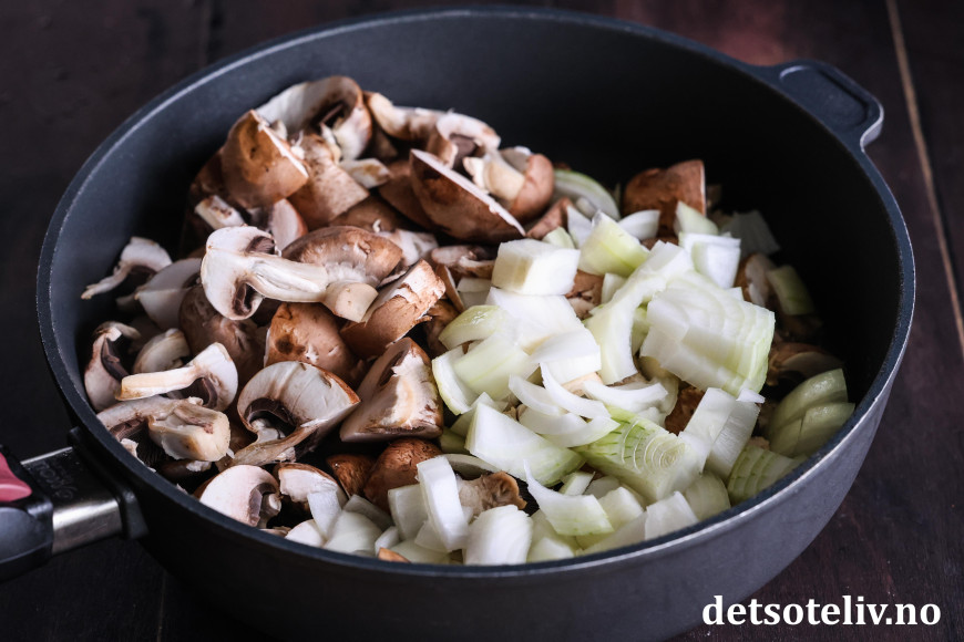 Skjær soppen i store biter og hakk løken grovt. Ha dette i pannen sammen med smør.