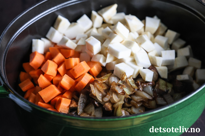 Kutt gulrøtter og sellerirot i terninger og ha også dette i gryten.