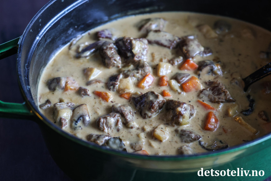 Kjøttet fra Skogens konge er noe av det flotteste man kan servere! Denne elggryten er av den kremete varianten, og lages med både kremfløte og seterrømme. Elgkjøttet kombineres med løk, sopp, gulrøtter og sellerirot. God viltkraft, brunost, einebær, laurbærblad og tørket timian gir nydelig smak.