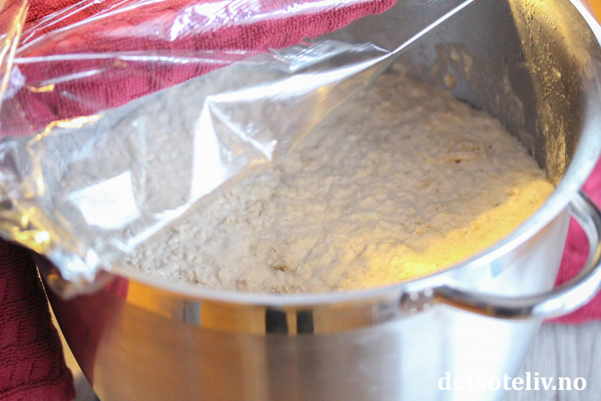 Løs opp gjæren i lunkent vann i en stor bakebolle (se tips). Tilsett sukker eller honning og havregryn. Rør dette godt sammen og la blandingen stå og svelle i 10-15 minutter.