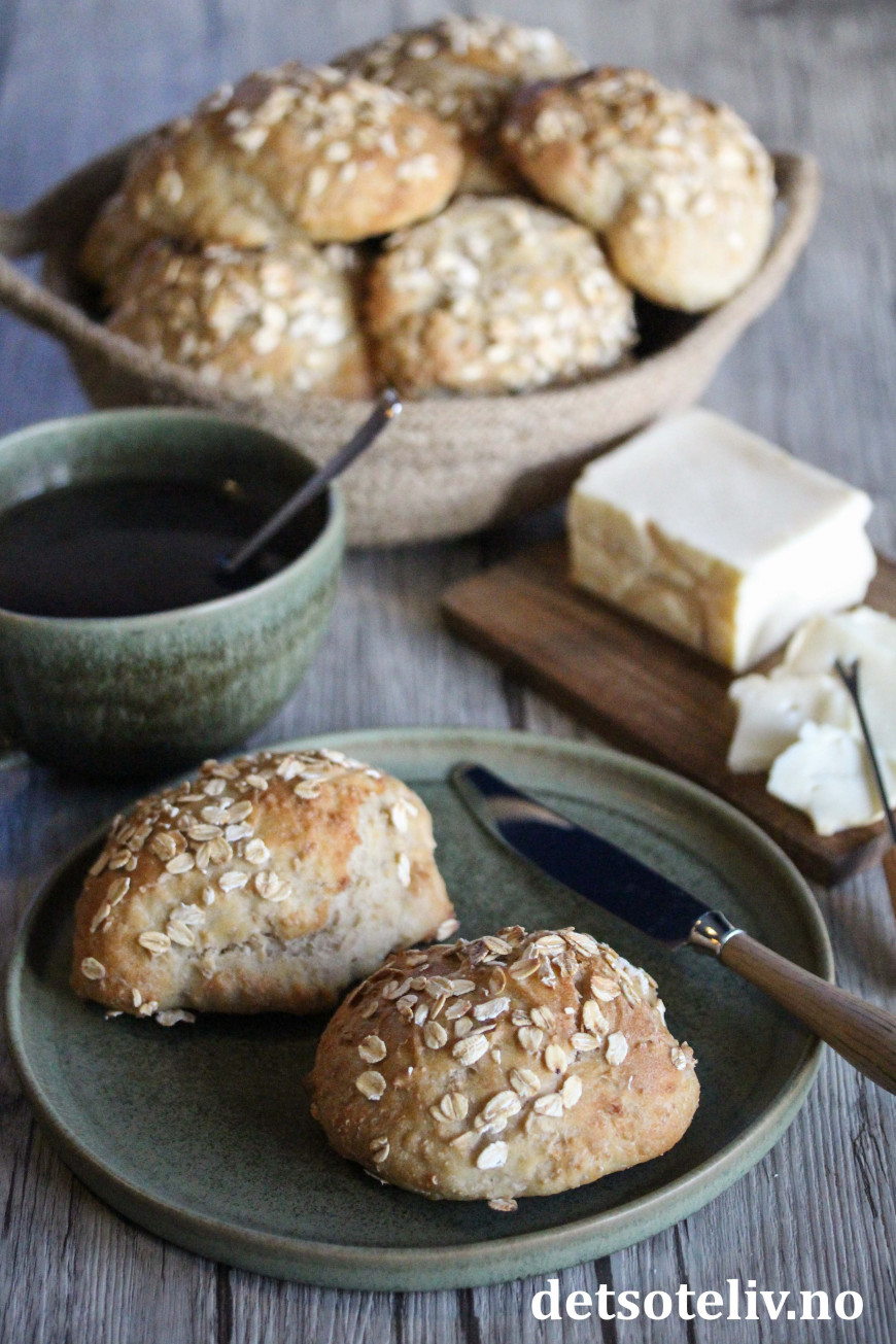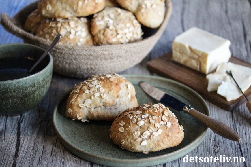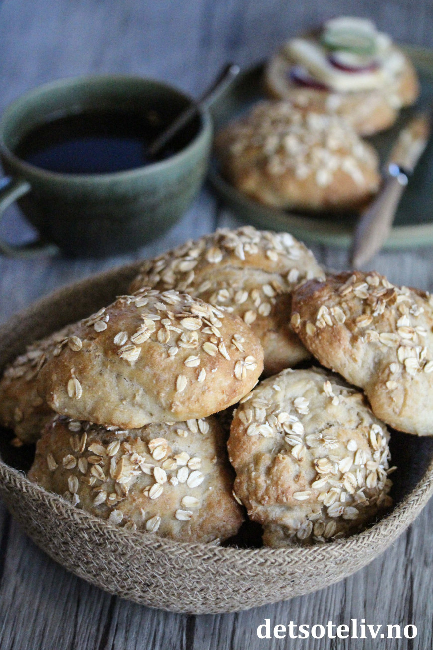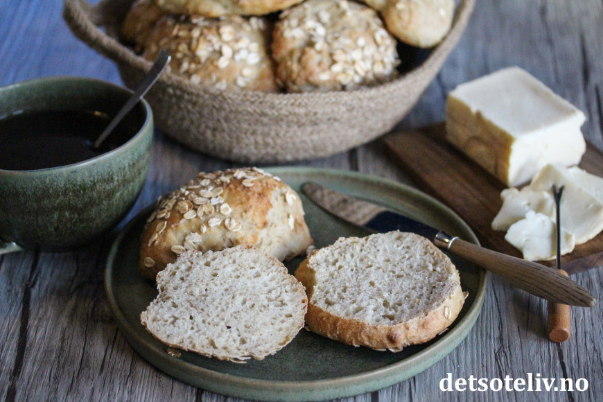 Dette er en vri på den kjempepopulære oppskriften på Eltefrie, kaldhevede rundstykker, som jeg publiserte her på Det søte liv rett etter nyttår. Denne gangen har jeg tilsatt havregryn og yoghurt som gjør at rundstykkene blir litt grovere og mykere, men de får fortsatt en herlig, sprø skorpe.