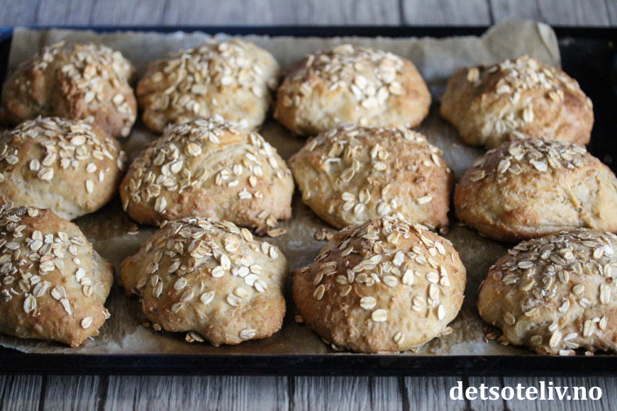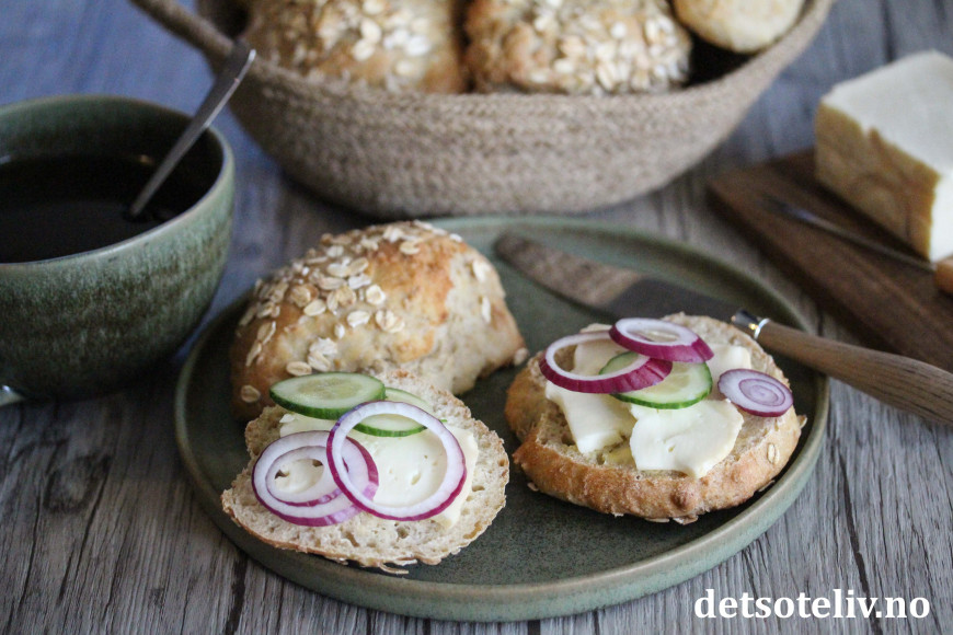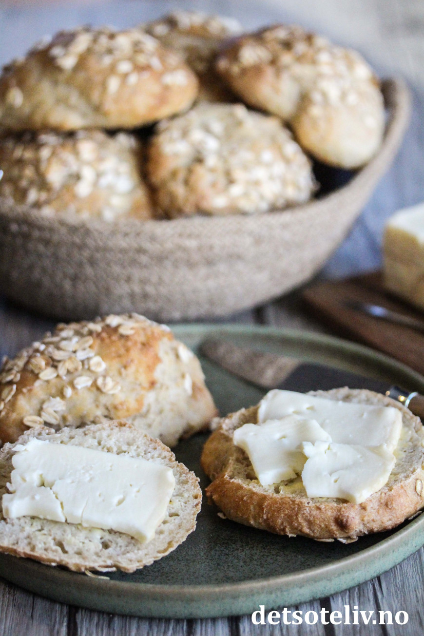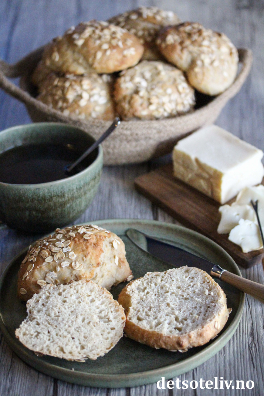Havrerundstykkene blir deilig myke inni og får kjempegod smak.