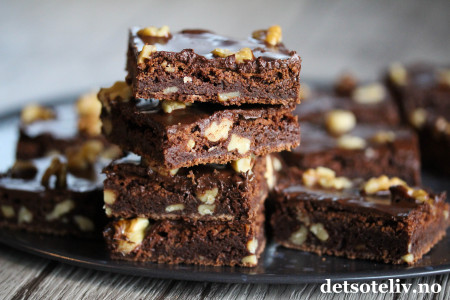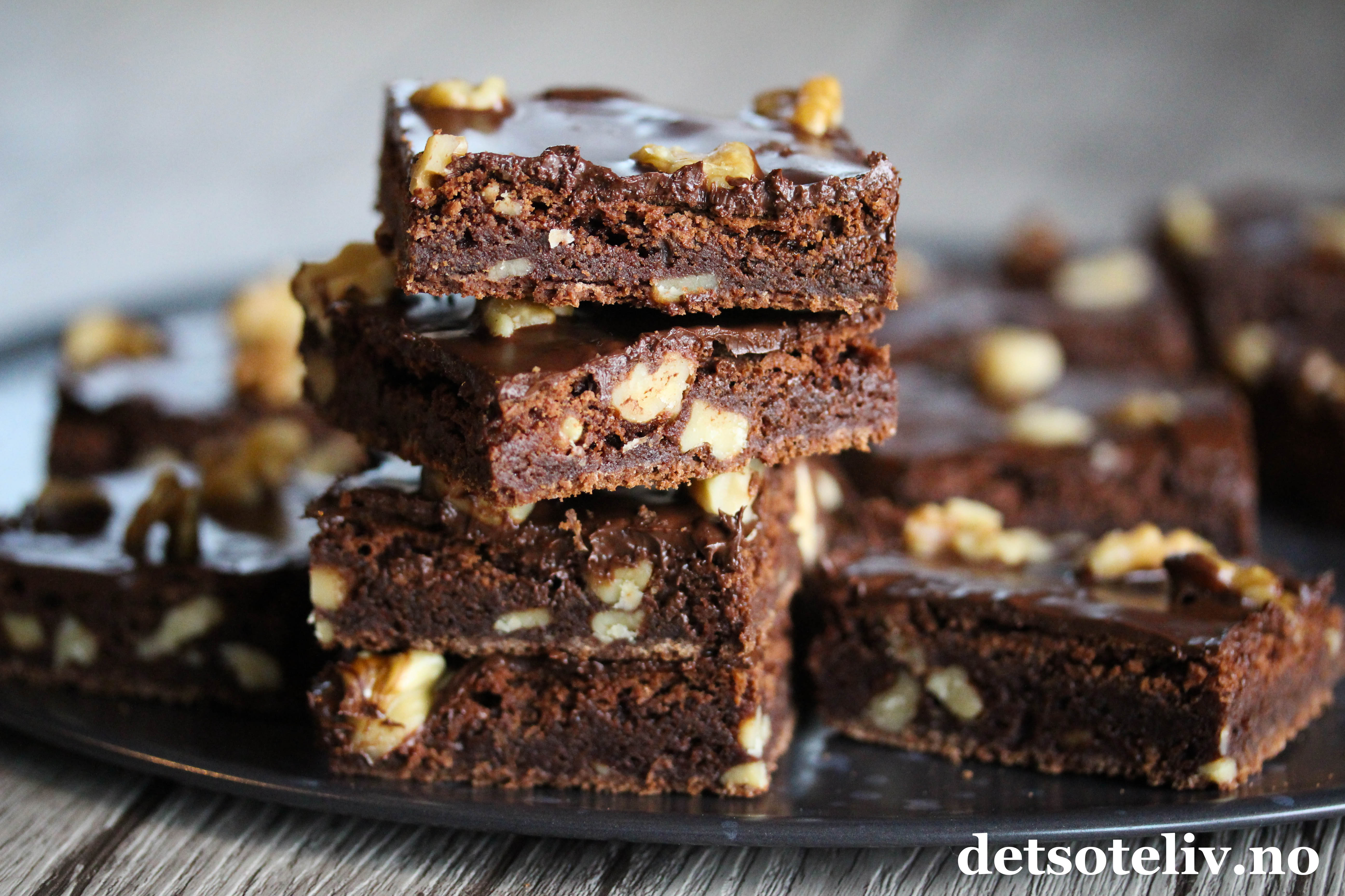 En herlig sjokoladebrownie med valnøtter i luksusvariant!