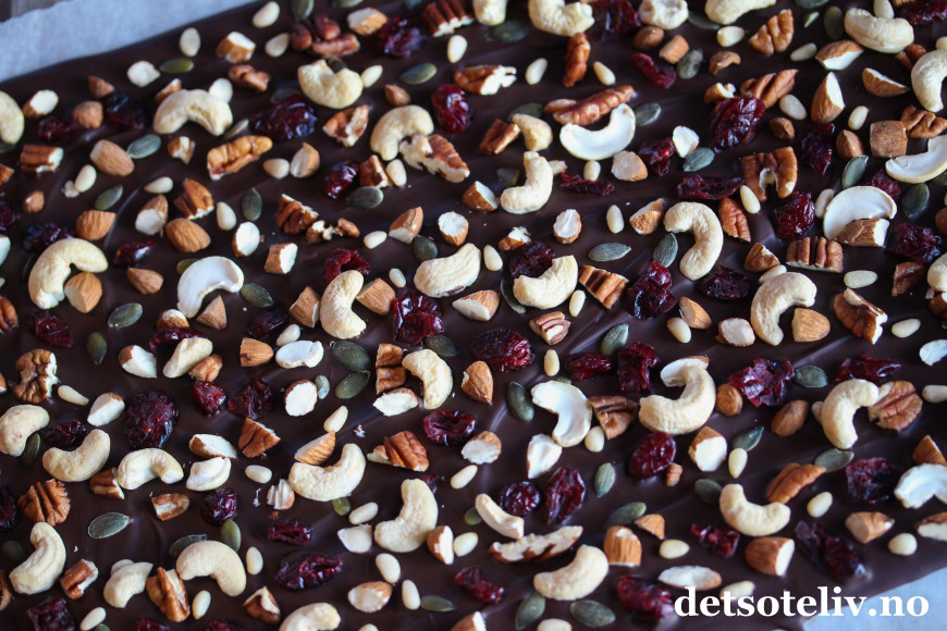 Det eneste du trenger å gjøre er å smelte sjokolade, stryke den utover og så drysse over nøtter og tørket frukt etter ønske. Sjokoladen settes i kjøleskapet for å stivne og så brekker du den fra hverandre i passe store biter.