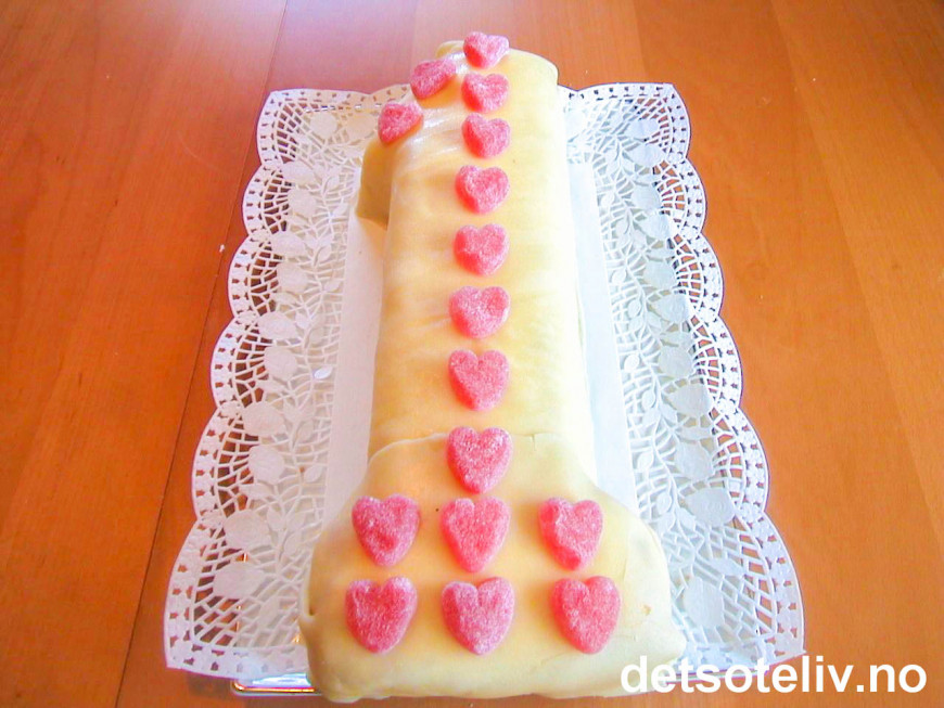 Pisk kremen til pynten og smør jevnt over hele kaken. Kjevle deretter ut marsipanen og kle kaken med marsipanlokk. Pynt etter ønske, for eksempel med rosa geléhjerter.