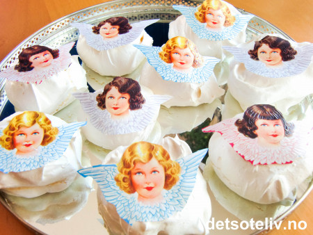 Sett topper på bakepapirdekkede stekeplater med to skjeer. Legg et engleglansbilde på toppen av hver marengs og trykk forsiktig fast.