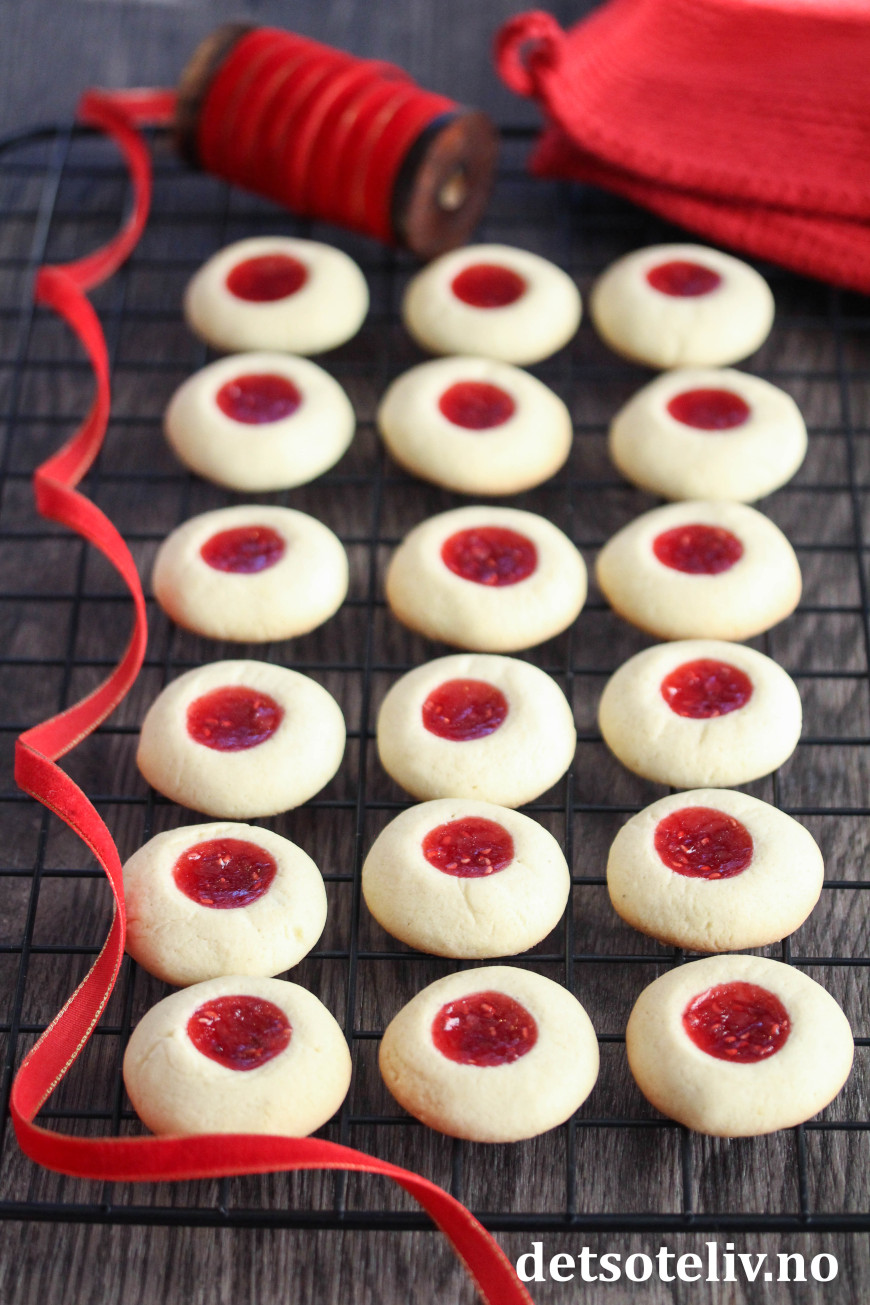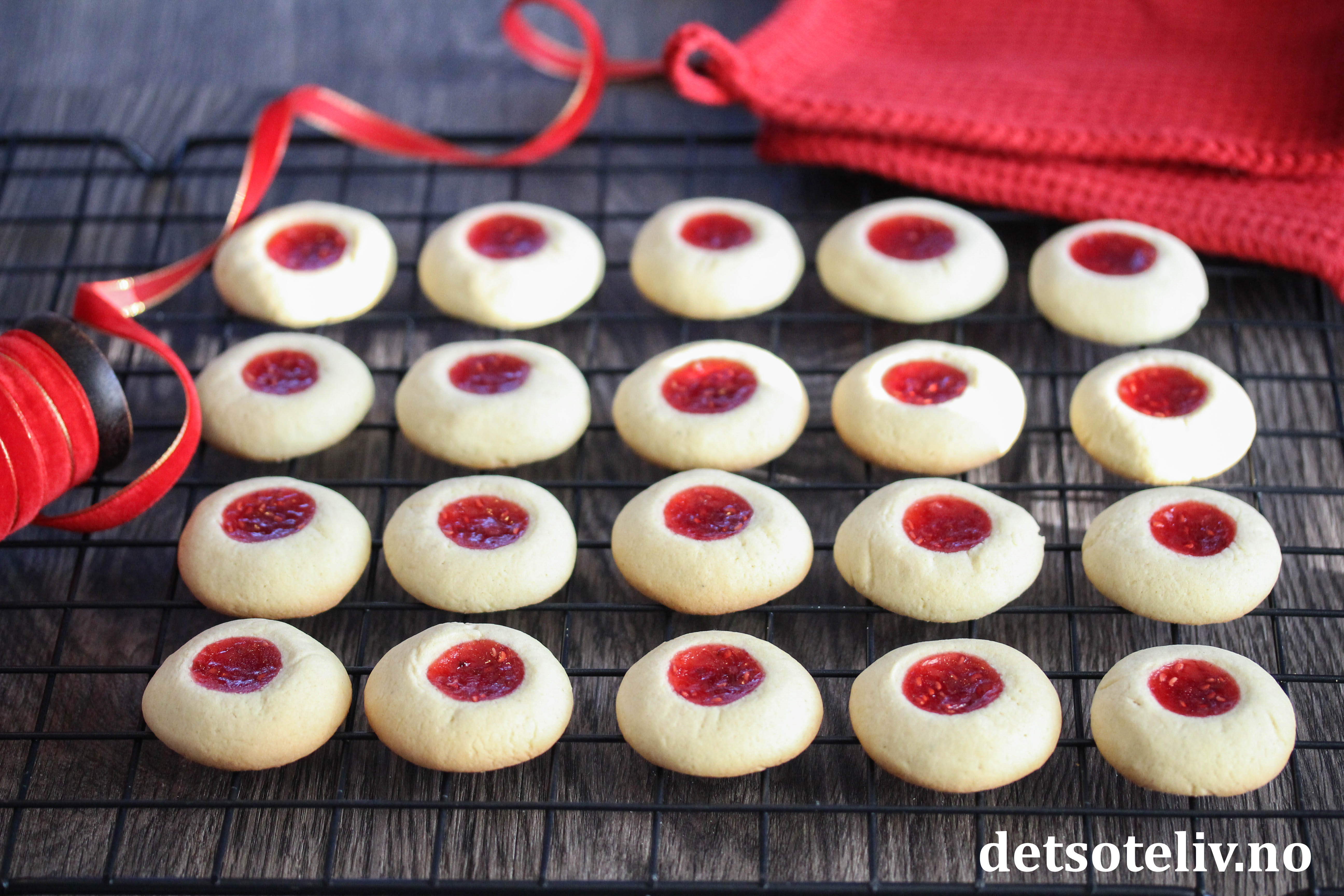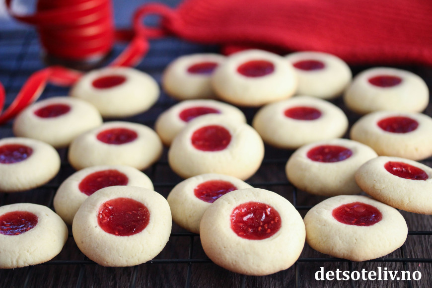 ♥ For lignende kaker, se oppskrift på Bringebærkaker, Syltetøykaker, Thumbprint Cookies, Jordbærkyss, Rosenmunnkaker og Gelépletter.