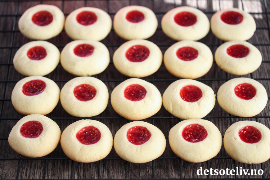 ♥ For å lage gropene i kakene kan du for eksempel bruke en stor hasselnøtt (eller du kan bruke skaftet på en tresleiv eller annet egnet redskap). Pass på at gropene er dype, men ikke så dype at du borer gjennom kakene, for da kommer syltetøyet til å renne ut av kakene under stekingen.