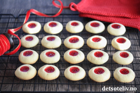 Dette er nydelige, små mørdeigskaker som fylles med en klatt syltetøy eller ripsgelé.