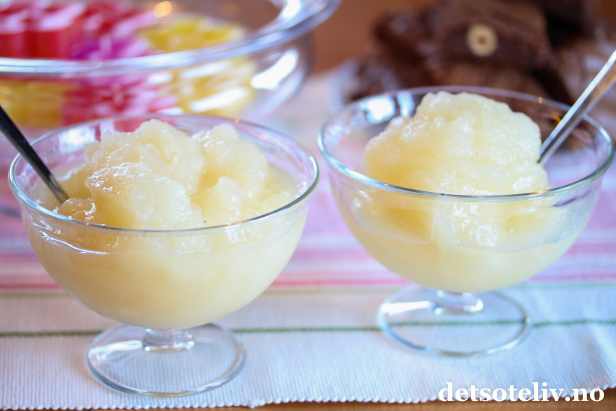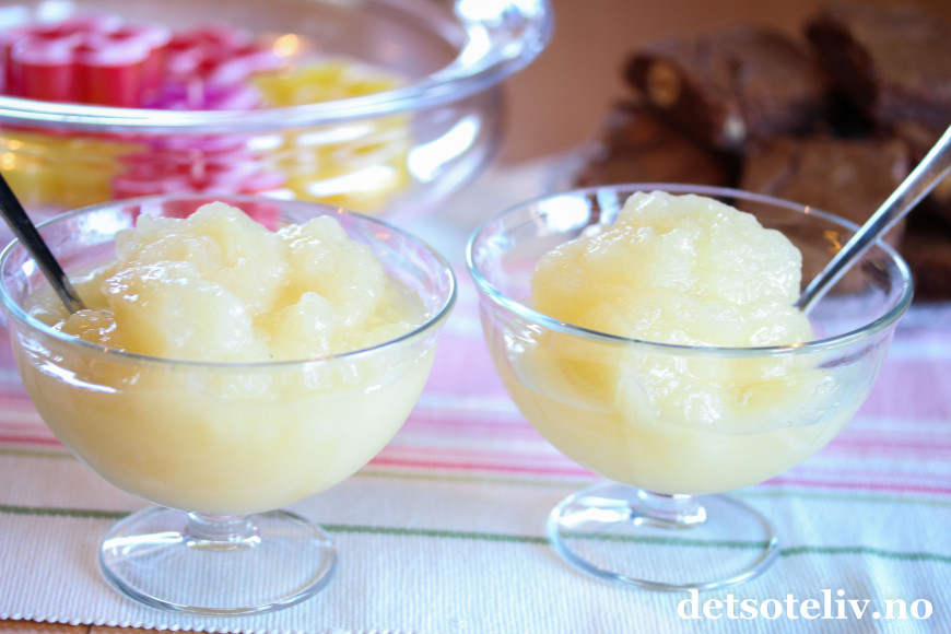 ♥ Sorbeten må serveres med en gang, for den tiner veldig raskt. Rester pæresorbet som du måtte få til overs kan du sette tilbake i fryseren. Sorbeten kan også fylles i isformer eller isbegre.