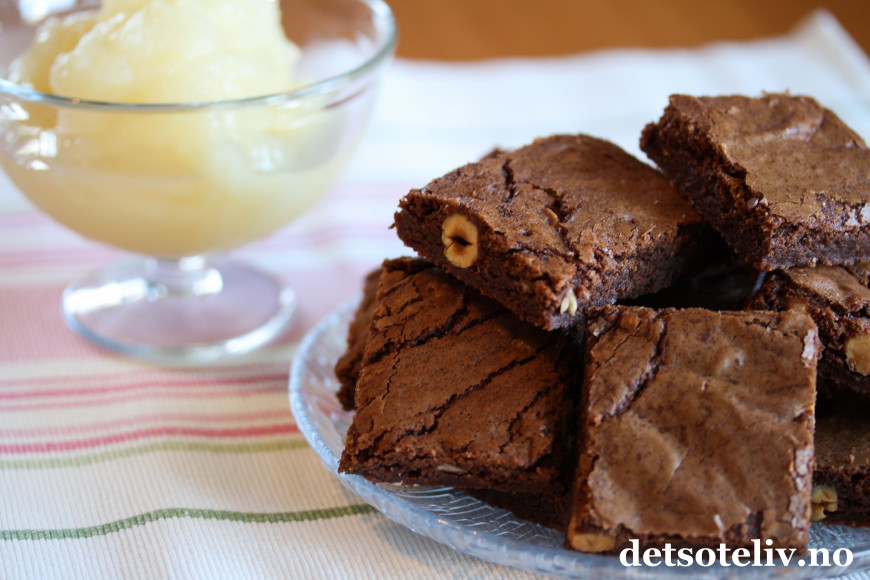 ♥ Pæresorbeten smaker nydelig sammen med nystekte brownies. Jeg har her brukt oppskriften på American Brownies fra Det søte liv, men har i tillegg tilsatt en neve grovt hakkede hasselnøtter.