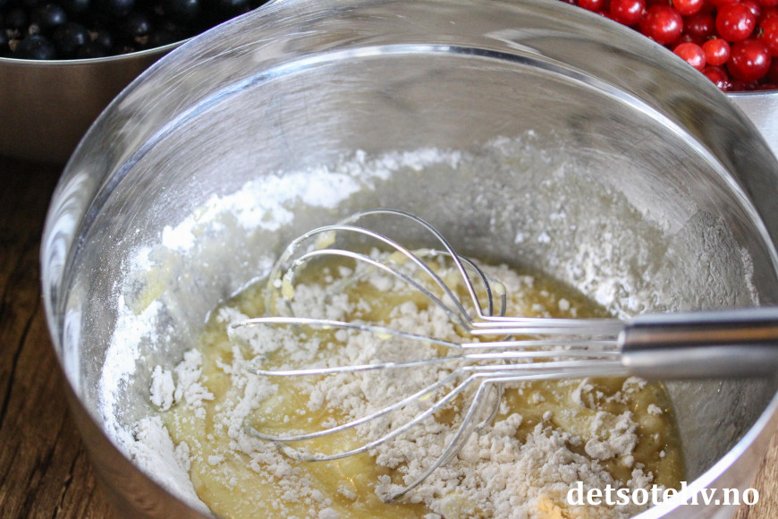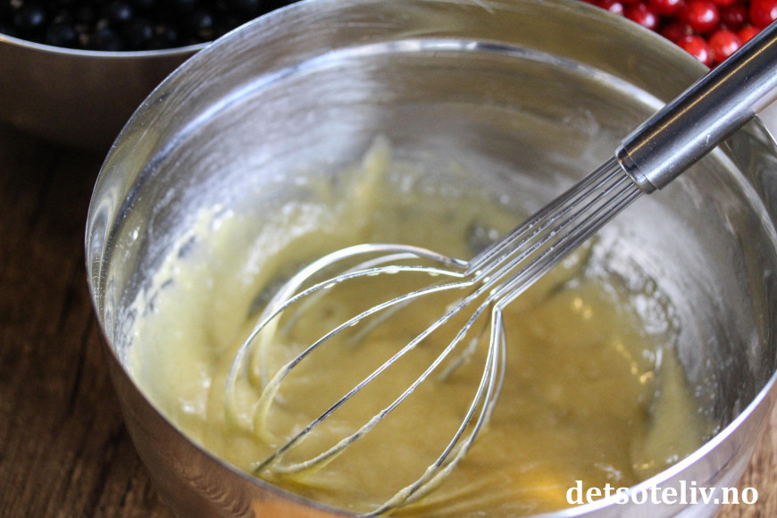 Visp egg og sukker lett sammen. Tilsett hvetemelet og smeltet smør. Rør deigen jevn.
