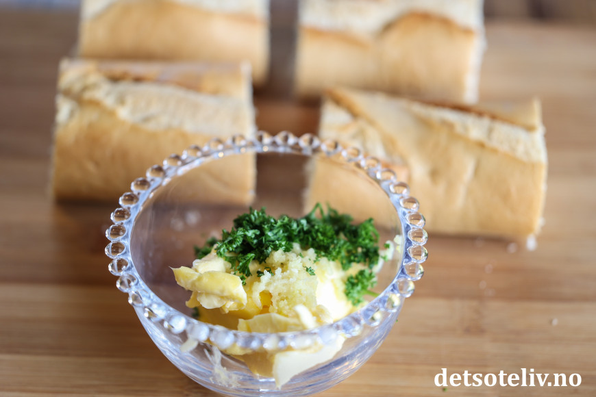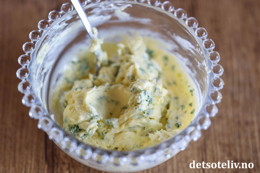 ♥ Pass på at smøret er romtemperert, så er det lett å røre det sammen med presset hvitløk og hakket persille.