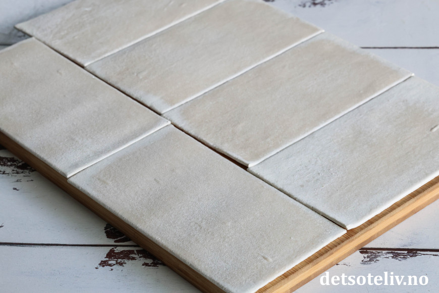 Kjevle litt på hver plate til platene har størrelse på ca. 10 x 20 cm. Bruk en linjal og renskjær kantene med en skarp kniv. Del rektanglene i to, slik at du får to firkanter på ca. 10 x 10 cm av hver plate.