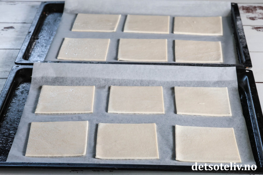 Legg de frosne butterdeigsplatene utover på bordet og la de tine (det tar ca. 20 minutter).