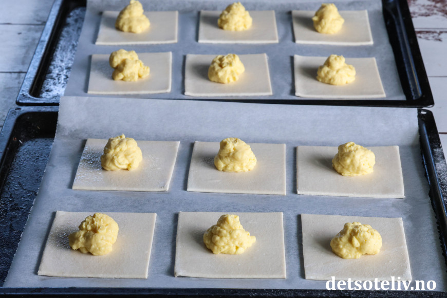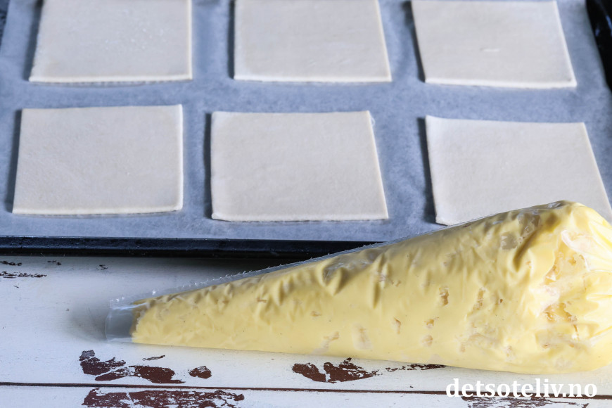 Legg eller sprøyt 1 stor spiseskje vaniljekrem i midten på hver firkant.
