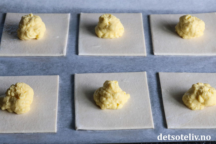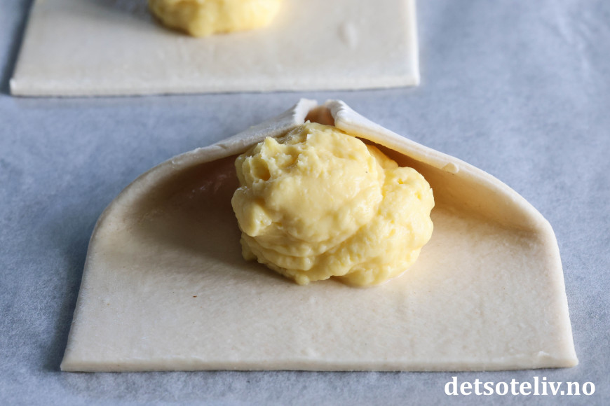 ♥ Vær nøye med å brette hjørnene helt inn til midten på kaken. Under steking vil hjørnene løfte seg opp og synliggjøre fyllet.