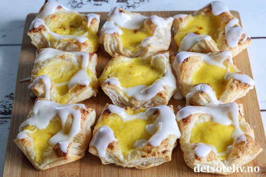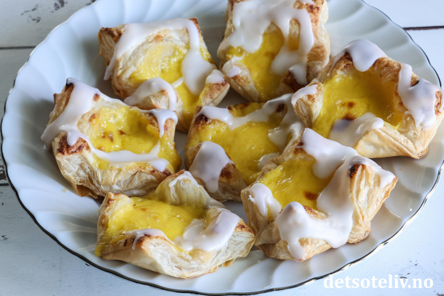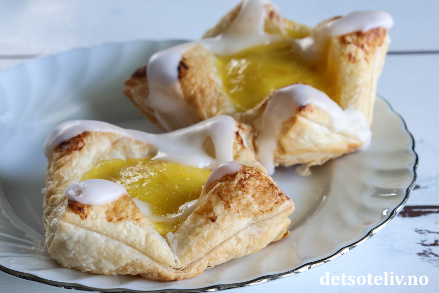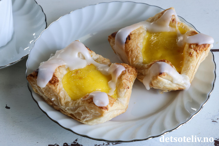 ♥ Se også Enkle wienerbrød med marsipan og bringebær, Enkle wienerbrød med eple og Enkle wienerbrød med vaniljekrem og blåbær.