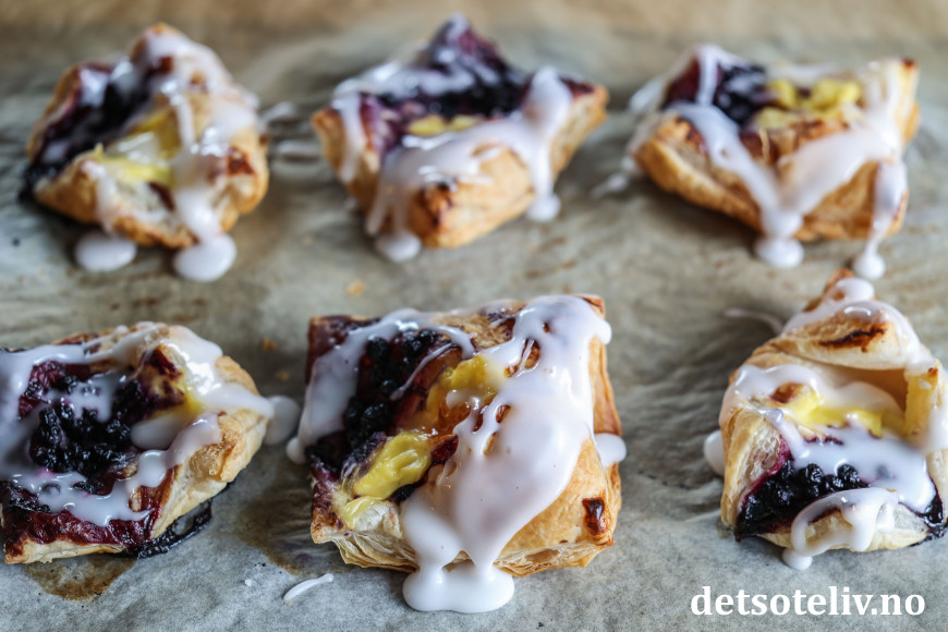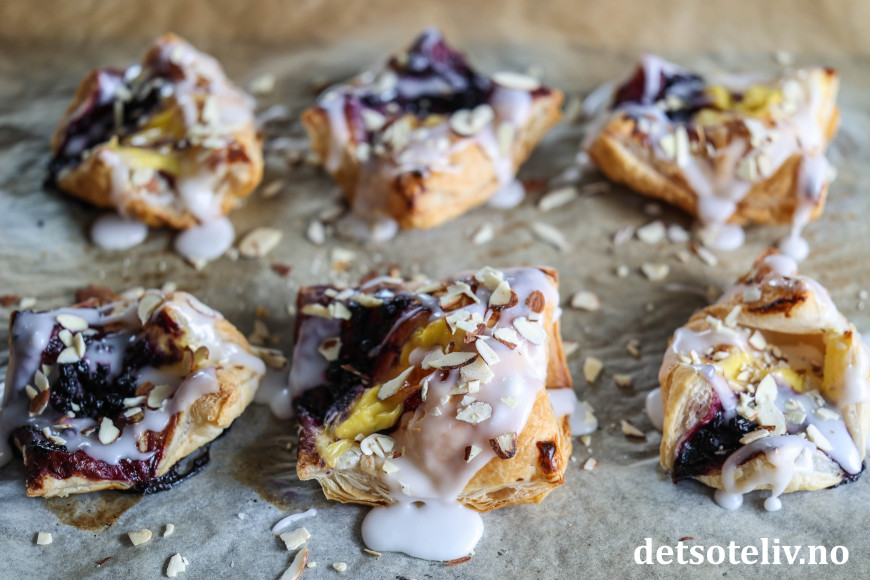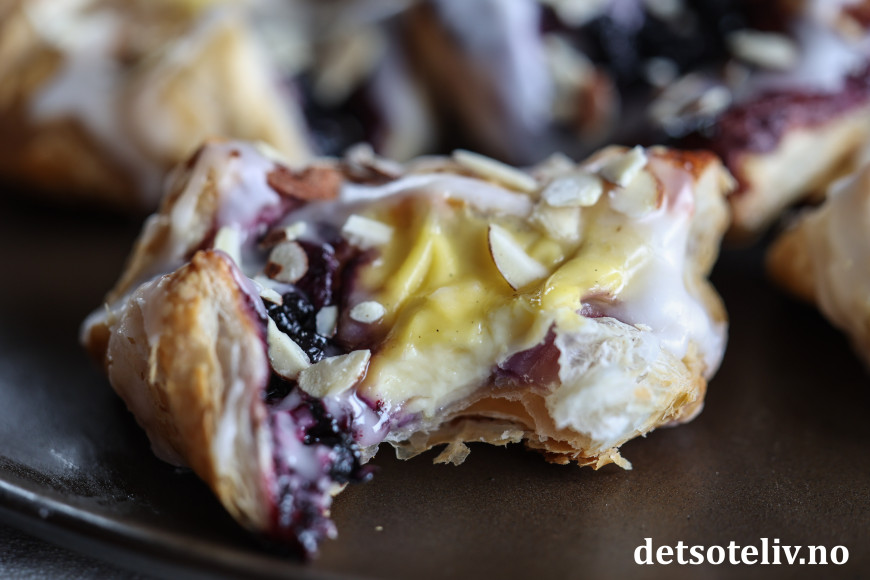 Wienerbrødene lages med ferdigkjøpt butterdeig, som jeg her fyller med blåbærsyltetøy og vaniljekrem. Melisglasur og mandelflak på toppen, og du har noen kjempegode, nystekte wienerbrød til kaffen!