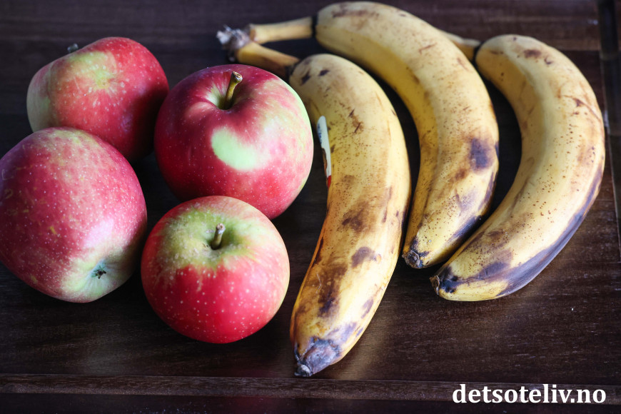 ♥ Bruk skikkelig modne bananer og gjerne norske epler for god smak på kaken.